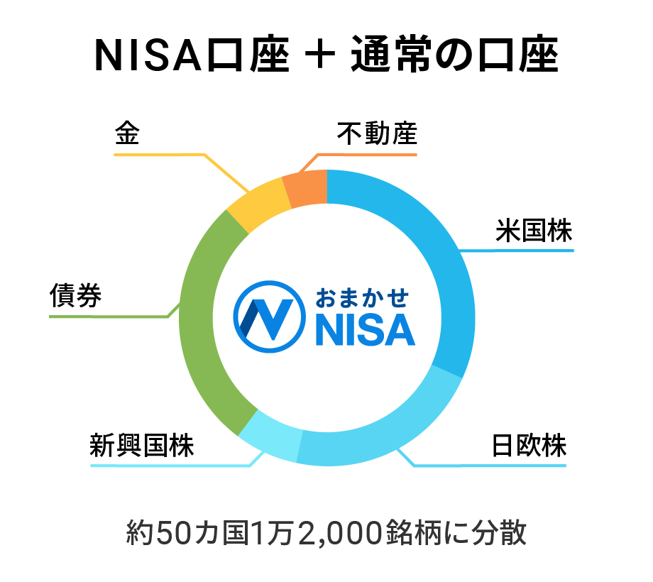 「おまかせNISA」では、たいこうNaviの「長期・積立・分散」による資産運用を、非課税メリットがあるNISA口座を活用しながら行います。通常の口座での運用と同様に、世界約50カ国、1万2,000銘柄へ自動で分散投資をします。