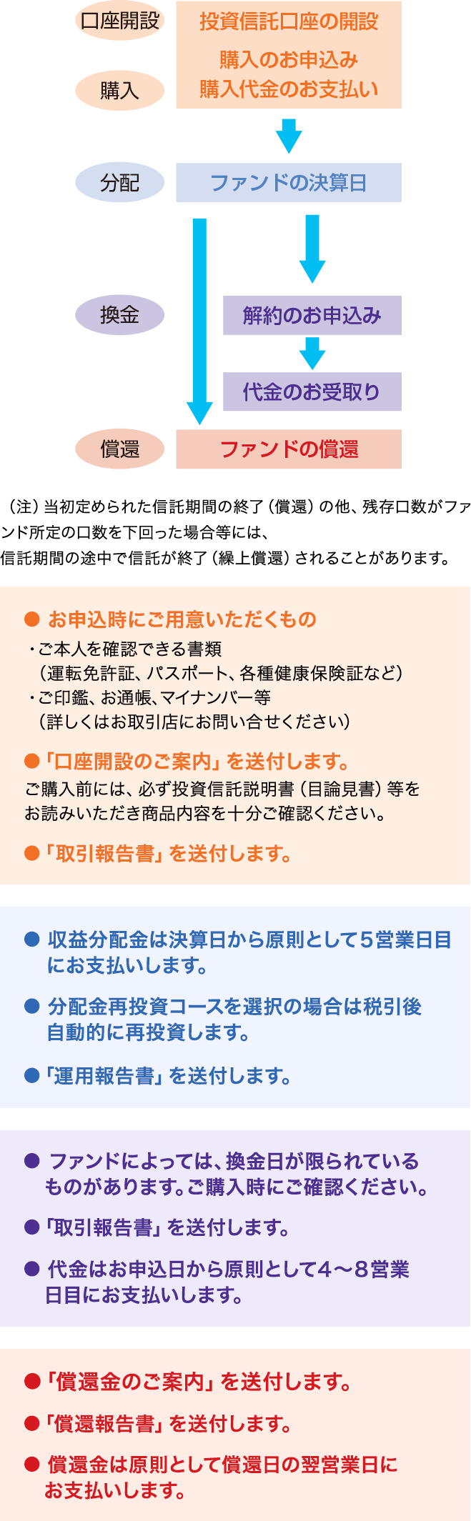 口座開設、ファンドの購入・換金など各取引の内容は、各種報告書類の郵送によりお知らせします。