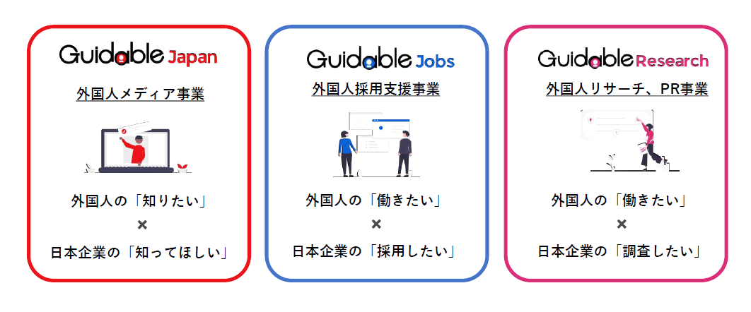 外国人向けHR事業「Guidable Jobs」、外国人向けメディア事業「Guidable Japan」、外国人向けマーケティング事業「Guidable Research」 |