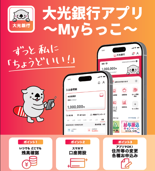 株式会社大光銀行(本店 新潟県長岡市、頭取 川合 昌一)は、2025年10月31日(金)に公表しておりました、新バンキングアプリ「大光銀行アプリ~Myらっこ~」の提供を開始しますので、お知らせいたします。